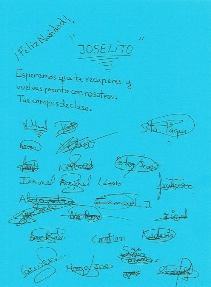 En estos días tan especiales y gozosos para todos no nos hemos querido olvidar de nuestro querido alumno José Benítez Lara. que está recuperándose en un hospital de Málaga. Desde aquí sus compañeros de 5º curso le mandan esta bonita postal de Navidad.